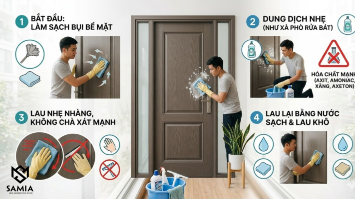 Sau khi loại bỏ bụi thô, chúng ta sẽ tiến hành xử lý các vết bẩn bám dính:- Đối với bụi bẩn thông thường hoặc vết bẩn nhẹ: Chỉ cần dùng một chiếc khăn mềm đã được làm ẩm bằng nước sạch. Nhẹ nhàng lau đều khắp bề mặt cửa từ trên xuống dưới. Đặc tính của vật liệu composite là bề mặt trơn nhẵn, ít bám bẩn nên đa phần các vết bẩn thông thường sẽ được làm sạch ngay lập tức, trả lại vẻ sáng bóng cho cánh cửa mà không cần dùng hóa chất.