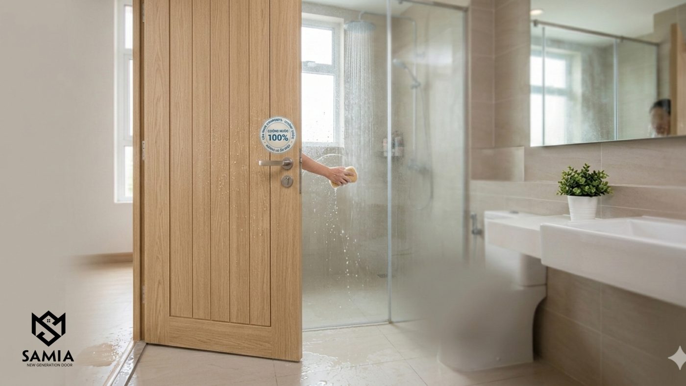 Đây là ưu điểm nổi bật nhất của cửa composite. Với cấu trúc đồng nhất được tạo nên từ bột gỗ và nhựa PVC ép chặt, cùng với lớp film PVC được phủ bên ngoài, cửa composite của Samia có khả năng chống thấm nước tuyệt đối. Điều này có nghĩa là cửa không bị thấm nước, không trương nở, cong vênh hay biến dạng ngay cả khi ngâm trong nước suốt 24 giờ. Nhờ đặc tính này, cửa composite trở thành lựa chọn lý tưởng cho những khu vực thường xuyên tiếp xúc với nước và độ ẩm cao như nhà vệ sinh, nhà tắm, phòng xông hơi, hay thậm chí là khu vực bể bơi. Hơi nước và độ ẩm sẽ bị ngăn chặn hoàn toàn, giúp cửa duy trì được vẻ đẹp và độ bền ban đầu trong suốt thời gian sử dụng.