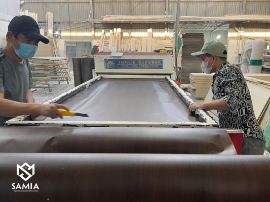 - Trộn nguyên liệu và ép tấm panel: Bột gỗ được trộn với nhựa composite và các phụ gia, sau đó ép thành các tấm panel lớn bằng máy móc hiện đại. Đây là giai đoạn tạo ra phôi cửa với độ đặc chắc và đồng nhất cao.
