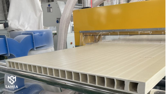 Quá trình tạo ra vật liệu WPC bắt đầu bằng việc trộn đều bột gỗ với bột nhựa. Hỗn hợp này sau đó được nung nóng ở nhiệt độ cao để nhựa tan chảy, bọc lấy các hạt bột gỗ. Sau khi hỗn hợp đồng nhất, chúng được đùn ép hoặc ép khuôn thành các tấm panel vững chắc, dùng để làm cánh cửa, khung bao và nẹp chỉ. Chính quy trình này đã giúp các phân tử nhựa liên kết chặt chẽ với gỗ, tạo nên một vật liệu nguyên khối, bền bỉ, không bị tách lớp hay biến dạng dưới tác động của môi trường.